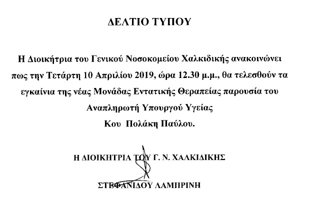 ΔΕΛΤΙΟ ΤΥΠΟΥ – Εγκαίνια της νέας Μονάδας Εντατικής Θεραπείας