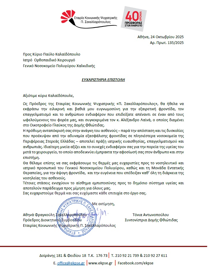 • Ευχαριστήρια επιστολή προς Χειρουργική κλινική – Ιατρούς και Νοσηλευτικό προσωπικό.